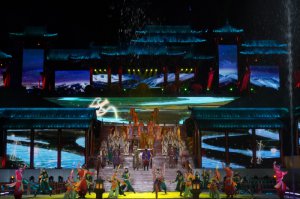 8月10日晚,华灯初上,麟游县九成宫西海苑内灯火辉煌,景色如梦似幻。在游客阵阵掌声及欢呼声中,大型实景山水演艺《千年九成宫》试演圆满成功。 《千年九成宫》由陕西桥杉汇能文化旅游有限公司出品,麟游县文旅局监制,西安演艺集团·西安歌舞剧院创排并参演。剧目灵感来源于唐代名臣魏征撰文,欧阳询书写的《九成宫醴泉铭》。而《千年九成宫》就是以此为蓝本,将铭碑中所记载的“杖导醴泉”“万邦来朝”等典故进行艺术化展示,并依托麟游厚重悠久的历史文化,以山为景,以水为衬,以史为鉴,运用现代声光电及定制化水幕投影等技术手段,在千年之后的九成宫景区内通过“情景再现”的方式进行演绎,引发并思考大唐盛世背后的精神内涵与时代价值。