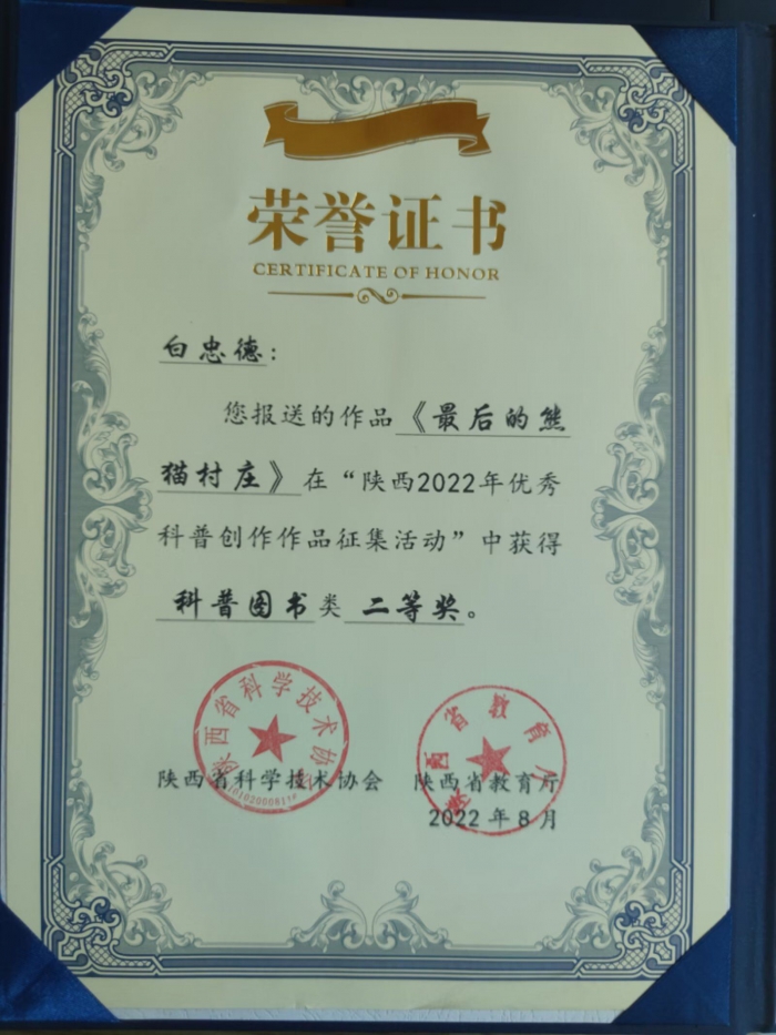 白忠德《最后的熊猫村庄》入选陕西省优秀科普作品名单 来源:文化艺术网-文化艺术报 作者:刘青 时间:2022-08-23