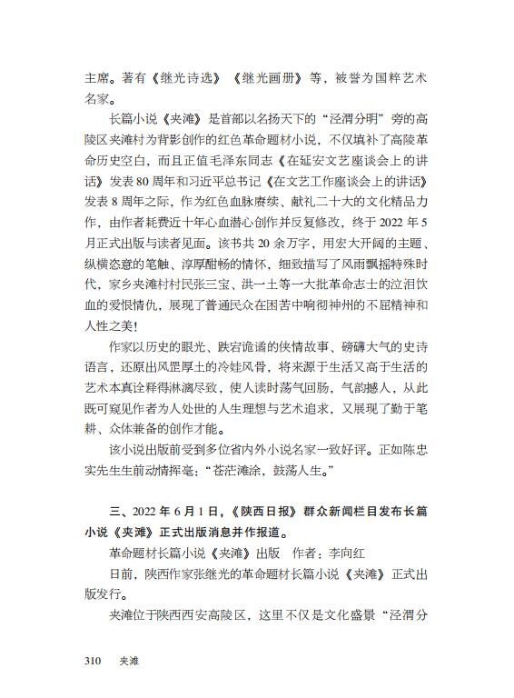 文化艺术网-文化艺术报讯(全媒体记者 吴汉兴)西安市高陵籍作家张继光长篇小说《夹滩》2022年5月由百花洲文艺出版社出版发行,受到广大读者和文学爱好者的欢迎,有关新闻媒体和国内各大网站先后进行深度采访和报道,省内外作家、评论家、专家学者给予关注并撰写发表有关书评。 为了满足广大读者的需要,《夹滩》2023年4月再版,在原有基础上增加了几万字的内容,力求小说的思想性和艺术性的完美统一,且在书后附录各界人士读后反馈。