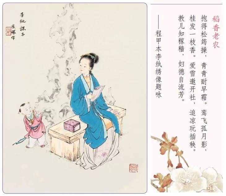 李纨课子 秦可卿是贾府的重孙媳妇,她与贾蓉的结合,是贾母在为儿孙择偶问题上浪漫理想的体现,即“不管他根基富贵”,“只是模样性格难得好的”。就这样,寒门薄宦出身的秦氏成了宁国府的长房长孙媳。在那个社会,女子改变自己“穿衣吃饭”的温饱问题有时靠婚姻,但到了夫家,尤其是大家族中,想提升地位,一般要靠两方面因素:一是子嗣,所谓“母以子贵”,二是娘家的势力。当得知自己病重不育,弟弟秦钟无心学业且在学堂闯祸时,种种打击,让她病入膏肓。作者对秦可卿之死的构思,据脂批透露,相关情节曾有过改动,由“淫丧”改为病逝。无论是何种死因,这样“兼美”的女子过早地辞世,本身就蕴涵一种红颜薄命的感伤,更何况是在全家老少异口同声的赞扬中,这位心性要强、能为贾家瞻前顾后的美少妇撒手入黄泉,作为贾府草字辈长孙媳的秦可卿身后无子,进而丧命,使得本来就后继乏人的贾府,痛失一位“可齐家”的裙钗。
