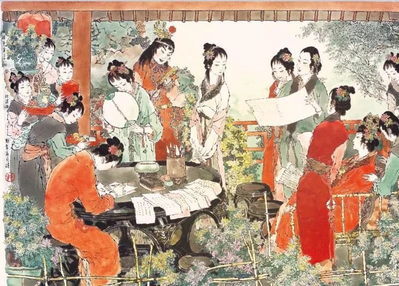 大观园作诗景象 一些源于生活真实的“本事”只是小说的背景,而不是小说的主体。小说的文学性需将熟悉的生活素材进行“陌生化”处理,经历化实为虚的过程。宛如酿酒一样,把作为原料的粮食,加以发酵,提炼出新的成分,也呈现出新的形态。从粮食到美酒,是一种脱胎换骨的变化;从生活素材到小说中的情节和人物,是一种艺术的升华。