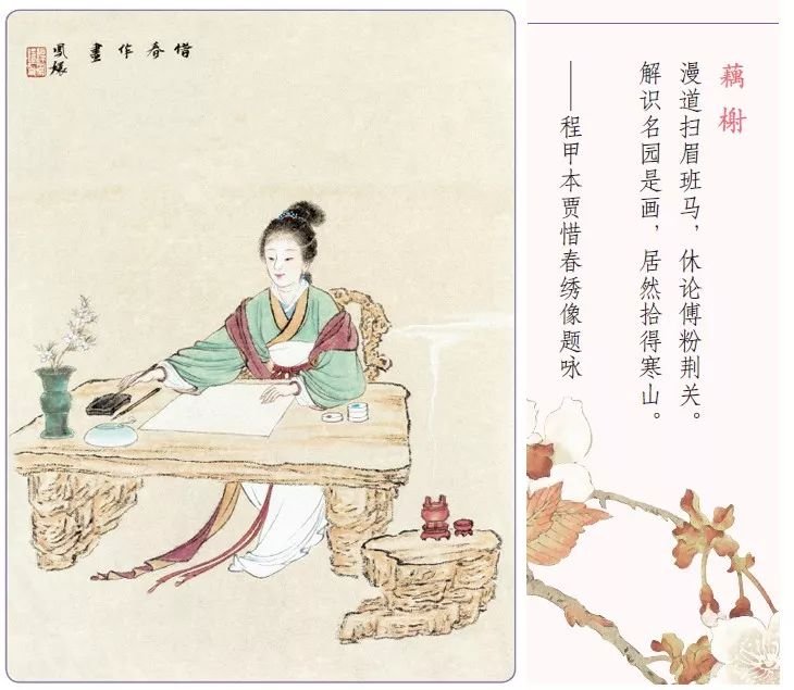 惜春作画 这十年我似乎体验了林黛玉在十个章回期间,相继辞母别父的心路历程。2001年读博期间,为了写北师大藏《脂砚斋重评石头记》的查访录,我专程拜访了周汝昌先生。除了畅谈抄本的问题,周先生对我的姓氏兴趣较浓,也启发我去关注曹彬家世等问题。 《红楼梦》是滋养心灵的补品,隔空神会的阅读心得是一种精神享受。对生活的体验越丰富,对这部书的感应就越深切。呼唤纯洁爱情的时候,自然“彷徨”着宝玉的彷徨。遭遇职场挫折的时候,或许“呐喊”着探春的呐喊。当孩子处于青春期,叛逆厌学又不得不面对考场的时候,也许你会理解贾政的苦衷。当母亲挂念儿子与怎样的女生交往的时候,也许会读懂王夫人的心思。说不完的情淡情浓,恰如开不完的春柳春花。《红楼梦》有歌咏青春恋情的诗篇,有演绎中年苦恼的戏曲,也有描绘神仙老人的画卷。十年后,如果再传红楼人物,我将会关注贾母,写她银发彩菊,随意诗书;写她藕榭近水,雅听戏彩斑衣;芦亭依山,趣赏红梅白雪。 编辑:慕瑜 |