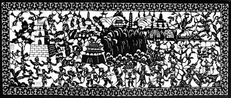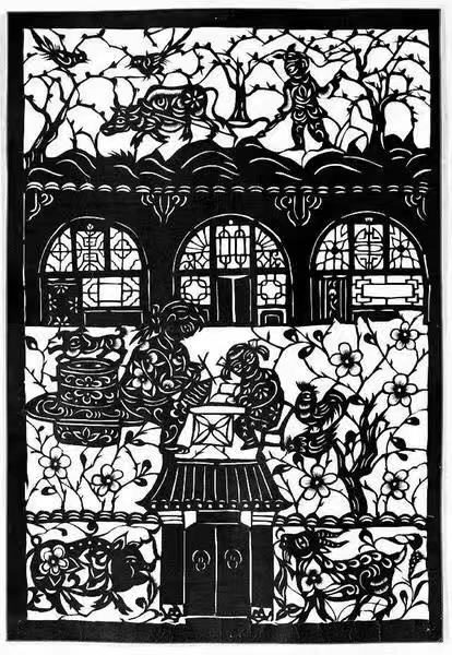 《安居乐业》 中国传统的民间美术是中华民族整个文化体系的重要组成部分,它与原始文明的仰韶文化以及商周文化、秦汉文化有着密切的血缘联系。而陕北更是地处中华民族文明发祥地的黄河流域,古老的文化沉淀孕育了陕北民间美术。陕北人以其特有的顽强性格与严酷的自然环境做着抗争,他们在茫茫黄土塬生息、繁衍,他们在劳作之暇以勤劳、粗壮的双手创造了神奇的民间美术:剪纸、面花、布艺、农民画。乡村的劳动妇女们用熟练的劳动工具和原材料,施展才艺,抒发情感。