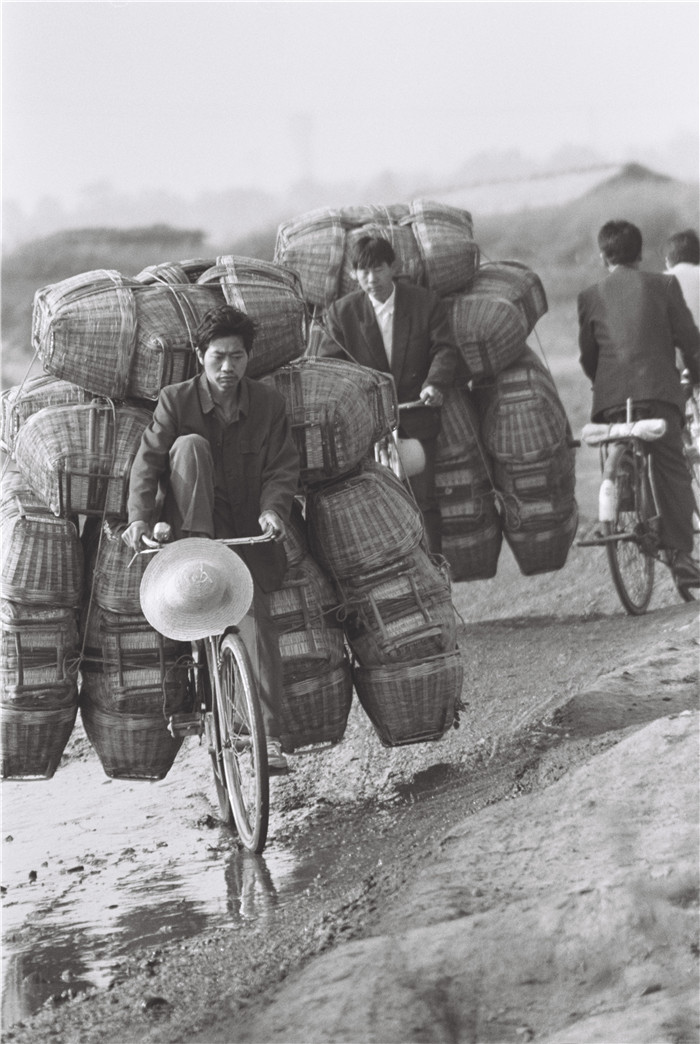 张先生这三本影集,除了奖状、会场、合影等照片外,大部分照片都体现了很高的水平,充分显现了作者扎实的基本功,娴熟的拍摄技术,恰到好处的拍摄角度和光影运用,还有令人称道的意境构思,出人意料的匠心独运,深刻丰富的社会效果。 照片让我看到了社会的发展变化,一张照片就是一件往事,若干照片就可看到一个时代。《自行车轮下的往事》的百余张照片,清晰生动地反映了几十年间汉中人民的经济生活情况,正如王蓬老师序中所写:“一幅幅熟悉的自行车景象,顿时把人带入已经逝去的岁月。那是几代中国人的记忆。”那时,自行车遍布城乡,公路上的自行车上载着木器、棕箱、竹器、沙发、农具、粮食、家畜等,到处都是川流不息。骑车的人们,大多是成年男子,也有少年儿童和老人、妇女。骑车人们的衣着随着时代发展也能看出变化,但总的状态还是朴素。相当多的人骑技高超,令人叹为观止。如一自行车上带了至少三十四个摞着的大竹筐,驾车人神态自然,面带笑容。一男人骑自行车后面坐一妇女,还拉着一辆两轮人力车,车上有几大口袋东西。一张注明“勉县,1993年”的生动照片,应该是在冬天的集市上,一位老爷子坐在停着的自行车后座上,戴着帽子和眼镜、吸着纸烟,身穿棉衣而架着的二郎腿是光脚穿着草鞋。众多照片丰富多彩,五彩缤纷。一张“南郑,1994年”的照片很是别致,一位骑车男子,着西服戴墨镜穿皮鞋,发型也较讲究,车上带了至少40多个竹编筛子等。有一张照片中骑车是西装领带皮鞋的年轻男子,后坐一妇女,在泥泞路上费力前行,我猜想,是不是带着媳妇回门的新郎官?
