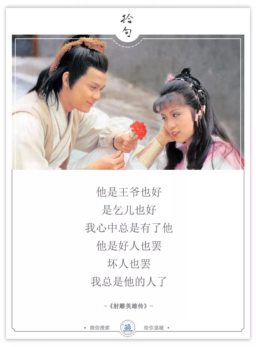 金庸笔下不仅有快意恩仇的江湖 更有各式各样的爱情故事 其中这三种爱情 也许你会似曾相识 第一种是郭靖和黄蓉的爱情 这是最美的爱情 遇到的第一眼就预定了对方的余生 一起从青葱岁月走到霜染白鬓 只要有彼此在 生活处处都是清喜的水泽 第二种是段誉与王语嫣的爱情 倘若段誉在追求无果下决定放弃 倘若王语嫣对慕容复依旧死心塌地 这段感情将无疾而终 但幸运的是 段誉的不离不弃让他最终抱得美人归 可又有多少人如段誉一样执着 换来的是自己的遍体鳞伤? 第三种是李莫愁和陆展元的爱情 曾你侬我侬 曾私定终身,对未来充满遐想 他们深爱过,视彼此为唯一 奈何人心易变 陆展元的离开让李莫愁因爱生恨 最后只留下一句“问世间,情是何物”
