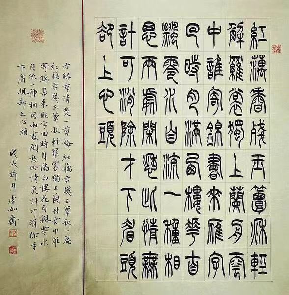 周筱君,1970年生,江苏南通市人,现为中国书法家协会会员、江苏省书法家协会刻字委员会委员、江苏省篆刻研究会会员、南通市书法家协会理事、南通市书法家协会刻字委员会主任、南通印社理事。 周筱君自幼承家学攻篆刻、小楷。2005年进修于中国书协培训中心,2006年求学于西泠印社,2013年进修于清华美院王志安刻字艺术创作研究班。 书法作品入展: 全国首届书法小品展 江苏省第三届新人作品展 南通书法大展 篆刻入展: 西泠印社首届中国印大展 百年西泠·中国印丰泽园杯优胜奖 百年西泠·西湖风大赛 百年西泠·金石缘大赛 西泠印社第七届评展 百年西泠·金石华章大展 百年西泠翰墨千秋大展 江苏省篆刻大展 江苏省第五届青年篆刻展 入选书法报“书坛新秀”推荐榜等 刻字入展: 全国第八届刻字艺术展 全国第十届刻字艺术展 第三届国际刻字艺术展 中日刻字交流展 江苏省刻字艺术提名展 “大美集美”全国中青年刻字名家提名展 “江海情怀·梁溪行”无锡三人展 作品赏析如下: