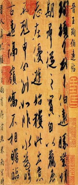 《伯远帖》为东晋著名书法家王珣给亲友书写的一封信,因首行有伯远二字,遂以帖名。共5行47字,纵25.1厘米,横17.2厘米,现藏于北京故宫博物院。