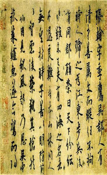 《张翰思鲈帖》亦称《季鹰帖》,纸本,纵25.2厘米,横33厘米。是欧阳询为张翰写的小传,属于行楷,共十行,每行九至十一字。字体修长严谨,风格平正中见险峻之势,是欧书中的精品。