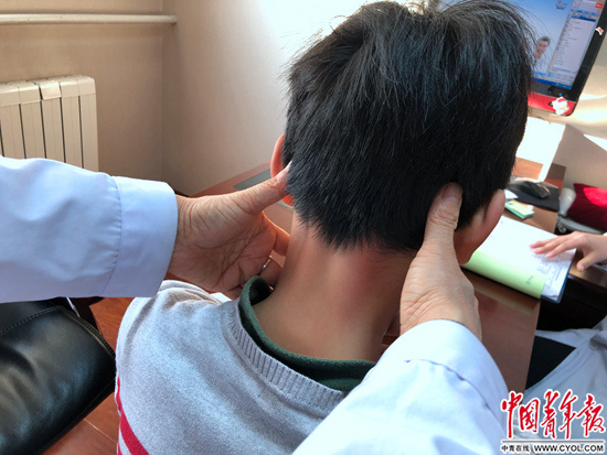 读小学五年级的天天是李爱儒当天接诊的第二位患儿。天天患有过敏性鼻炎、咽炎,老觉得嗓子不舒服。李爱儒在给天天推拿脖子附近的穴位时发现他脖子后面的两块肌肉(也就是颈部夹脊穴的位置)粗细不一样,右边的肌肉明显比左边的粗。