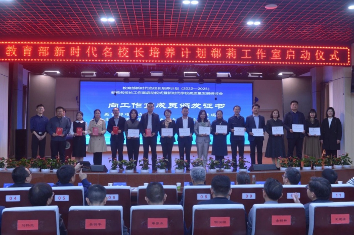 张晓黎、王彬武共同为郗莉名校长工作室揭牌,与会领导向15位加入名校长工作室的成员颁发证书并赠书。