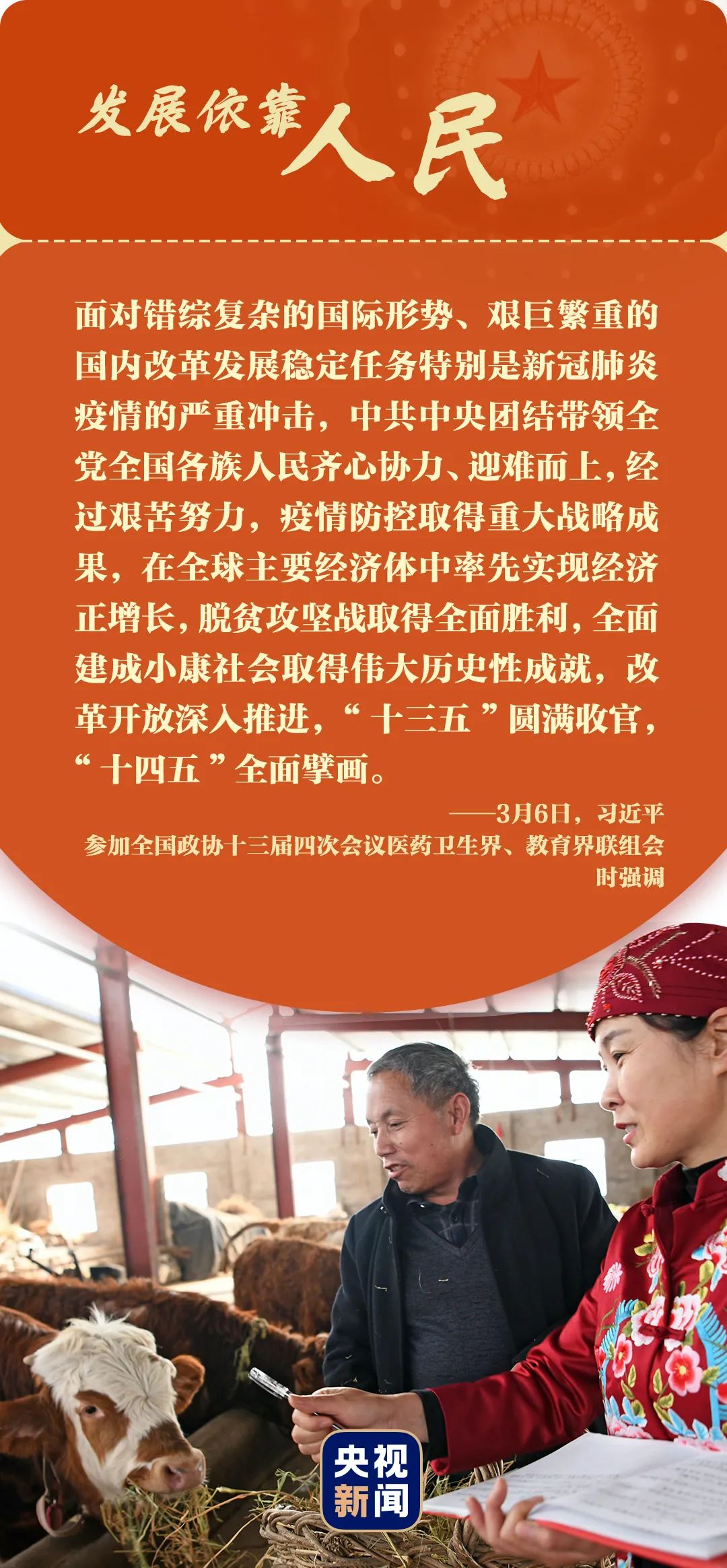 人民,在习近平总书记心中重千钧。今年全国两会,下团组参加审议、讨论,总书记多次提及“人民”二字。 3月5日,在内蒙古代表团,总书记指出要“坚定不移为中国人民谋幸福”。 3月6日,在医药卫生界、教育界委员联组会上,总书记强调“要把保障人民健康放在优先发展的战略位置”。 3月7日,在青海代表团,总书记要求“始终把最广大人民根本利益放在心上,坚定不移增进民生福祉,把高质量发展同满足人民美好生活需要紧密结合起来”。 回望“十三五”,以习近平同志为核心的党中央团结带领全党全国各族人民砥砺前行、开拓创新,决胜全面建成小康社会取得决定性成就。 展望“十四五”,我国发展环境面临深刻复杂变化,习近平总书记多次强调必须“立足新发展阶段、贯彻新发展理念、构建新发展格局、推动高质量发展”,实现带领人民创造幸福生活的奋斗目标。