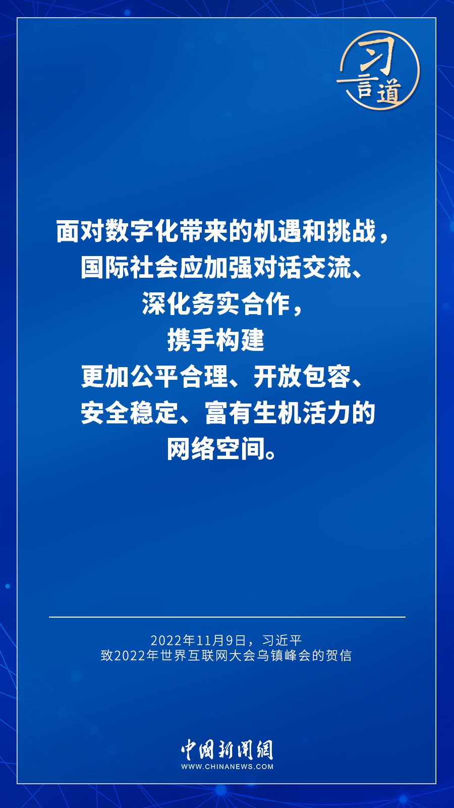 11月9日,国家主席习近平向2022年世界互联网大会乌镇峰会致贺信。