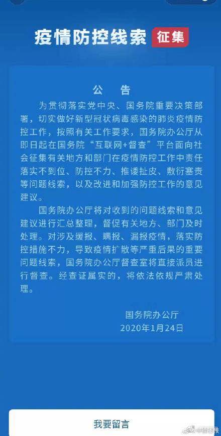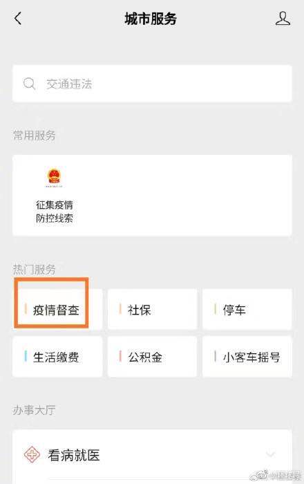 24日起,国务院办公厅在国务院“互联网+督查”平台面向社会征集有关地方和部门在疫情防控工作中责任落实不到位、防控不力、推诿扯皮、敷衍塞责等问题线索,以及改进和加强防控工作的意见建议。现在,打开微信进入支付界面,点击城市服务,选择“疫情督查”,就可以跳转到国务院的征集页面了!转发,周知!