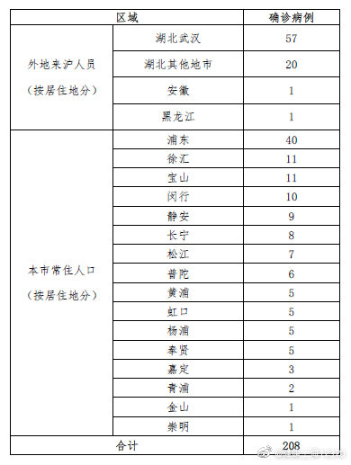 截至2月3日24时,上海市已累计排除疑似病例523例,发现确诊病例208例。确诊病例中,男性107例,女性101例;年龄最大88岁,最小7月龄;116例有湖北居住或旅行史,8例有湖北以外地区居住或旅行史,84例有相关病例接触史;外地来沪人员79例,本市常住人口129例。具体情况如下: