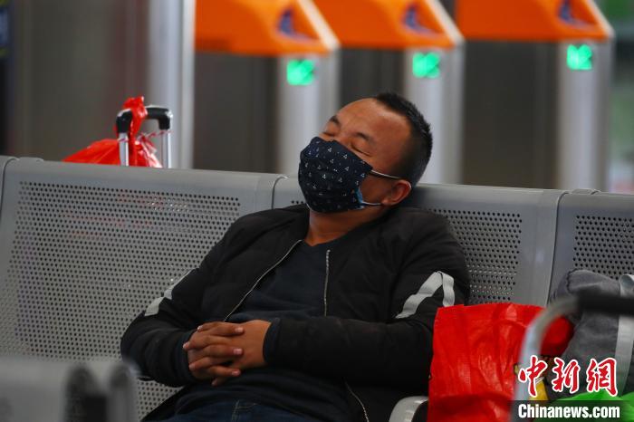 南昌西站候车大厅内,戴着口罩打盹的旅客。 刘占昆 摄