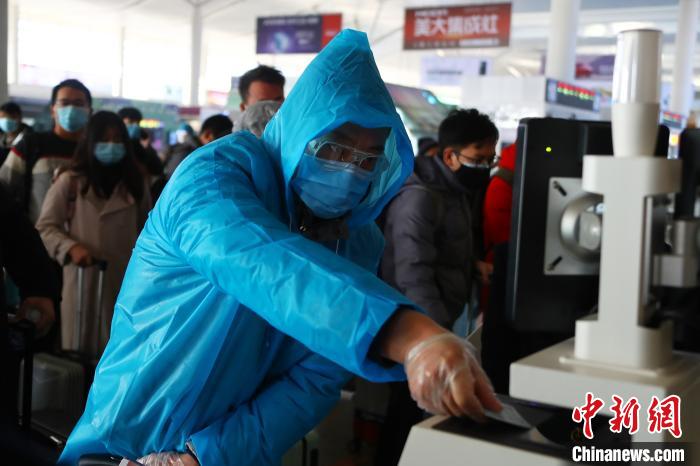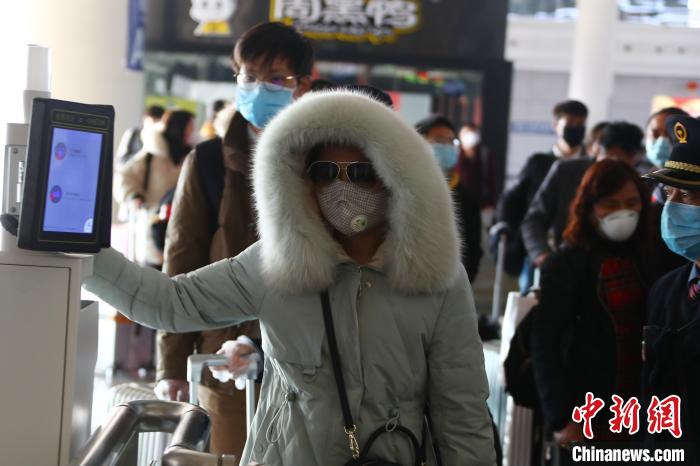 戴着眼镜和口罩的旅客,把自己包裹得严严实实刷身份证进站。 刘占昆 摄