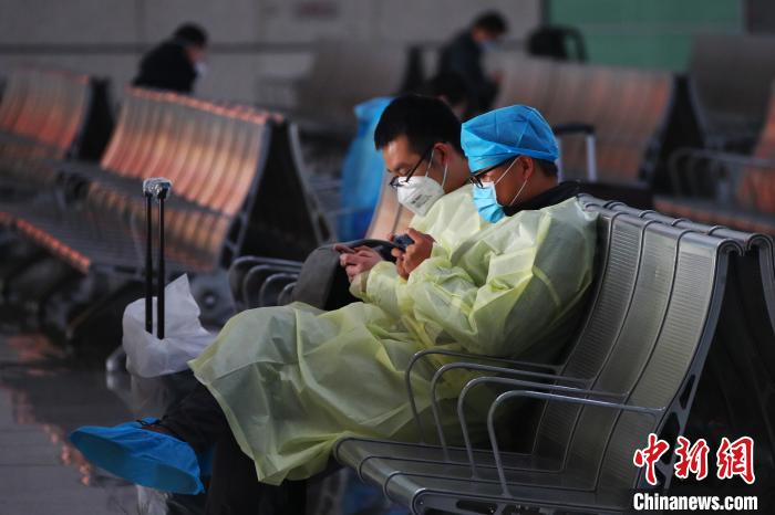 穿着一次性雨衣,戴着护目镜的旅客正在刷身份证进站。 刘占昆 摄
