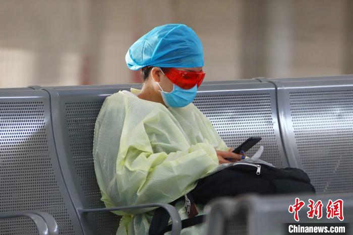 南昌西站候车大厅内,穿着一次性雨衣,戴着护目镜的旅客正在候车。 刘占昆 摄