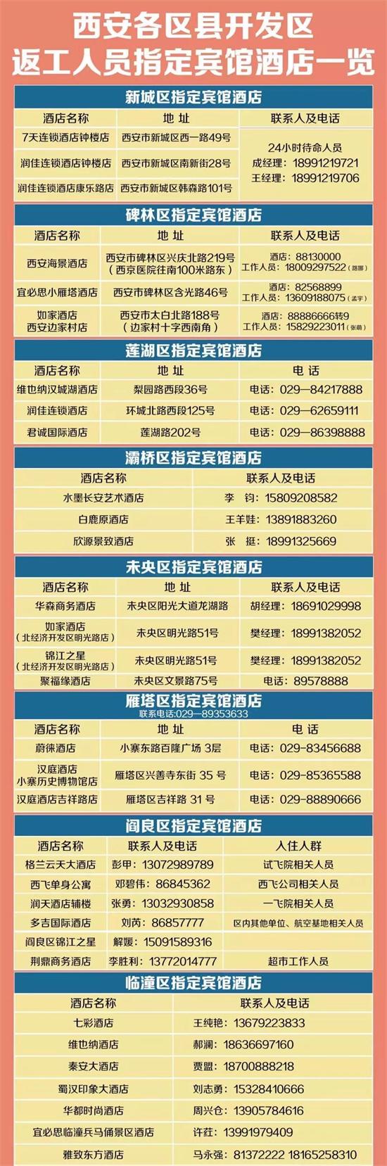 长庆油田公司兴隆园物业服务项目部管家部主任任永军表示,物业“管家”是他们特有的制度,在此次对抗疫情的战役中也发挥了很大的作用,比如居家留观过程中,一天两次的体温数据,留观期间的生活保障信息等都是由“管家”负责收集。人员信息核对的工作,也是由“管家”配合社区工作人员完成,针对业主、租住户等不同的主体,同时要求提供房号、身份证明、业主信息等不同的证明文件,保证信息核验真实有效。 据了解,因每个人的二维码只有三个小时的有效期,为了高效处理,不少街道、社区、物业、安保的力量被广泛地动员了起来,协调统一,就是为了不漏一人。 各区县返工人员指定宾馆酒店 如在本地没有住房等其他情况,则要去往指定的酒店。 对此,有闪电新闻的记者致电某指定酒店询问:对来自确诊病例较多的地区的乘客有没有特别规定时,前台工作人员给出了否定的答案,目前对地区还没有特别的规定,只有在“没有买的或租的房子住的情况下,才会安排酒店接待。”这位前台工作人员也证实了在酒店隔离政府补贴50元房费的说法,但只有“省外的身份证可以享受补贴”。