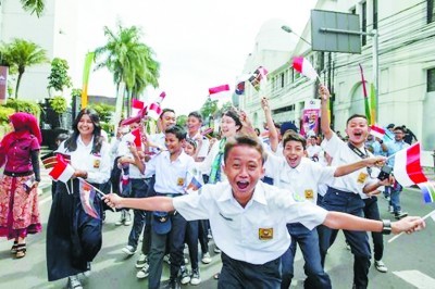 2015年4月24日,在印度尼西亚万隆,孩子们在万隆会议60周年纪念活动仪式现场欢呼雀跃。新华社发 编辑:慕瑜相关推荐: