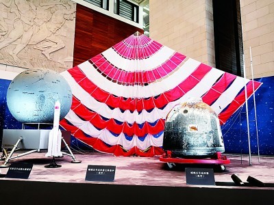在中国国家博物馆展出的嫦娥五号返回器原件。 记者 李韵 摄(光明图片)
