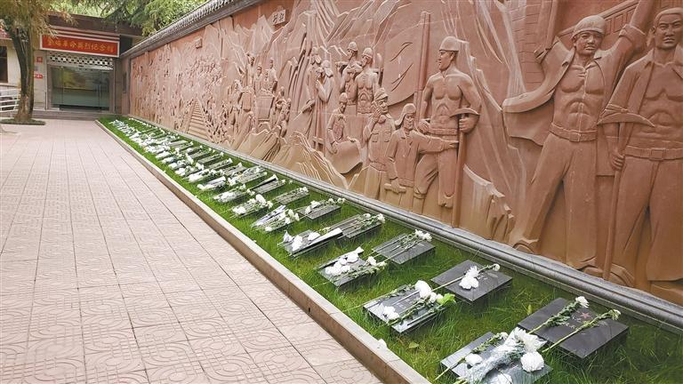 英烈浮雕墙前,56位英烈的卧碑上摆满了祭奠的鲜花。