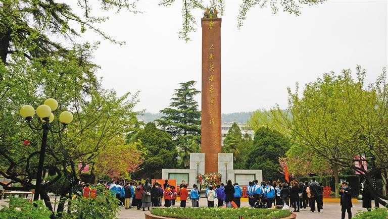 师生们在宝天铁路烈士纪念碑前缅怀英烈。