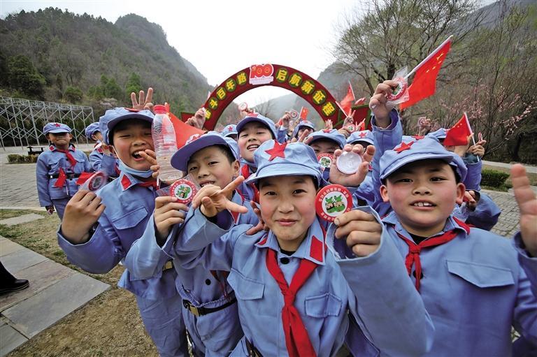 前往照金研学旅行的学生们在参观薛家寨红色景区后展示“研学纪念章”。记者 杨光 摄