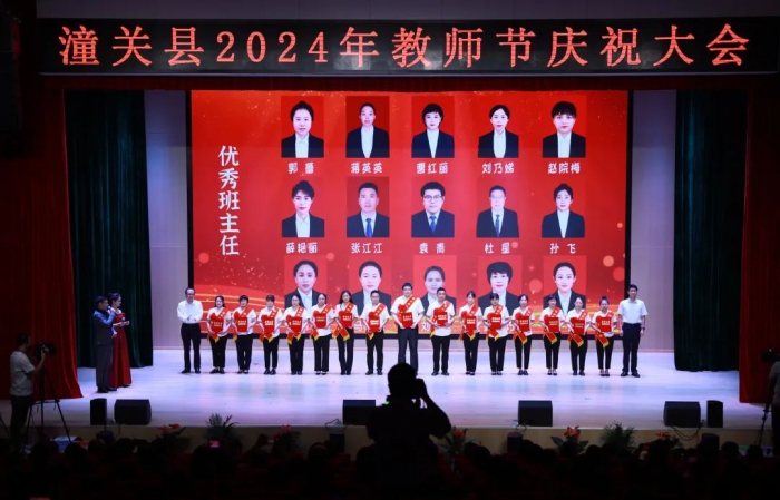颁奖仪式上,潼关县委、县政府对作出突出贡献的教育体育局奖励150万元,希望全体教育人发扬成绩、团结拼搏、再创佳绩。15个尊师重教先进单位、15名先进教育工作者、15名优秀班主任、38名优秀教师相继登台领奖。庄重、温暖的颁奖仪式,精准、凝练的颁奖词,胸前佩戴红花的绽放,典型代表事迹短片的播放,观众在阵阵热烈的掌声中致敬楷模,在感动与泪水的交织中深情礼赞师者。先进典型引领,优秀彼此激发,有效增强了广大教师立德树人、潜心育人的责任感、使命感和幸福感。