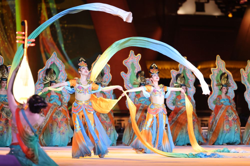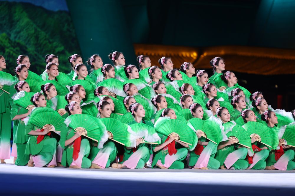 5月18日,演员在中国-中亚峰会文艺演出中表演。新华社记者 刘彬 摄 豪放的秦腔《梦回长安》与高亢的陕北民歌《天下黄河九十九道弯》交相呼应、余韵绵长,尽显古都西安开放和谐、进取奋发的文化神韵。 为青山绿水而歌,载欣载奔舞动蓬勃朝气—— 伴着《春天》婉转悠扬的节奏,一群豆蔻年华的姑娘舞步灵动、笑意盈盈,红绸绿扇飞旋出昂扬向上的精气神。大屏幕上,“秦岭四宝”朱鹮、大熊猫、金丝猴、羚牛次第展现,鸟兽虫鱼恣意栖息,人与自然和谐共生。