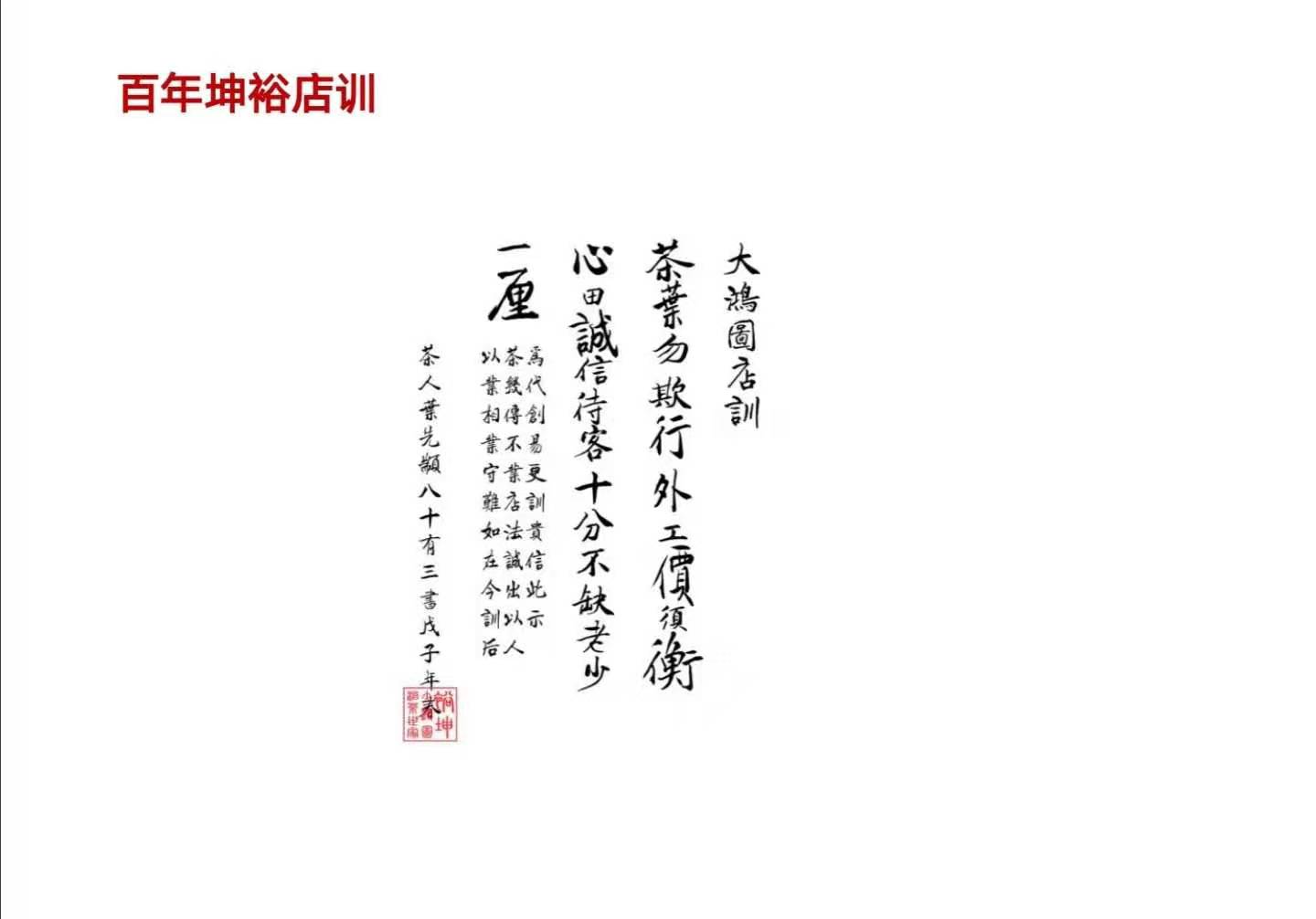 坤裕茶号兴盛于清末至民国年间,今天的大鸿图品牌创始人叶先生是其第五代传人。从福建周宁,到丝绸之路起点古都西安,百年坤裕大鸿图秉承坚守的态度,以一颗敬畏心和初心抱怀感恩,坚守茶味,不断把硕德淳风发扬光大,把鲜活、厚重、绵长的乡愁与割舍不断的文化血脉代代传承。