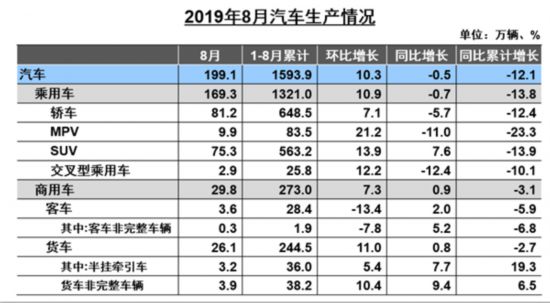 8月,汽车销量同比降幅有所扩大。产销量分别完成199.1万辆和195.8万辆,比上月分别增长10.3%和8%,比上年同期分别下降0.5%和6.9%,销量降幅扩大2.6个百分点。