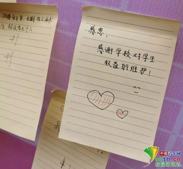 徐飞同学表示,自己本来是抱着寻找同感的目的前来围观,却被一些另类“吐槽”暖了心。有同学对学校表示感谢,“感恩,感谢学校对学生权益的维护!”对此,廖娇说:“同学们的维权知识在逐渐加深,我们特别开心,感觉自己的付出是非常有意义的。”