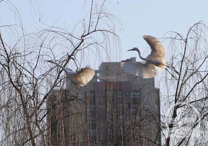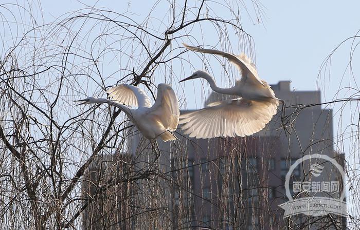 1月13日,古城西安迎来入冬以来难得的温暖天气,一对白鹭在环城公园旁的柳树上翩翩起舞,吸引了不少路人的目光。 西安报业全媒体记者 尚洪涛 实习生 刘慧珊 摄