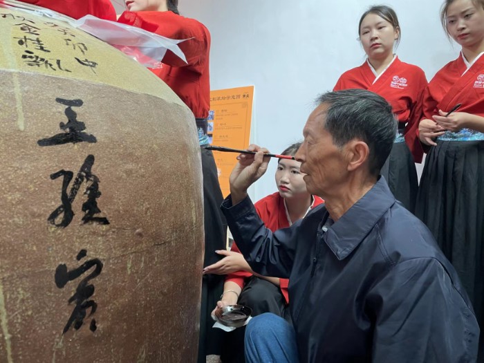 封坛仪式结束后,宋伟先生请诸位墨客雅士在厂职工食堂品尝了酒厂生产的各种黄酒,除传统的糯米黄酒外,还有添加了其他水果成分的黄酒,如桑葚果酒、桂花黄酒、青梅黄酒等。各类美酒色味俱佳,饮之若仙露琼浆、香味醇美、绵软甘甜、沁心润肺、唇齿留香、余味无穷。品尝黄官美酒后,不会书法的我也应约为黄官酒业题联一副:黄流清酒甘洌廉泉酿琼露;墨客雅士榛楛旱麓把玉瓒。