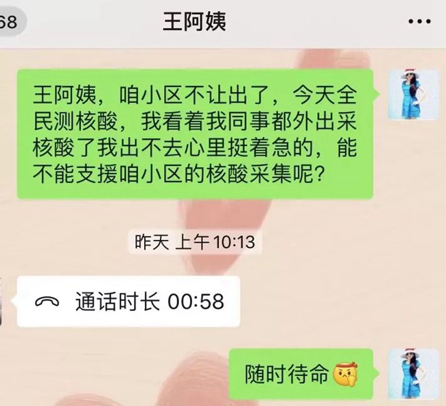 西安市中心医院杨晨雨、刘阳在核酸采样点。西安市中心医院供图 “闺女你是不是中心医院超声科的,我上次的超声就是你做的呢,查的很好了,等完了还找你复查啊,你辛苦了!”杨晨雨是西安市中心医院核酸采样队伍中的一员,在为社区居民做核酸采样时,一位阿姨认出了她。 原来,那位阿姨是看到了防护服上写的“杨晨雨”,就想起了这个为她做过超声的小姑娘。来自长辈的亲切称呼,让杨晨雨顿感温暖,患者能够记住她的名字,就是对她工作最大的认可。