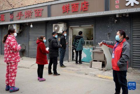 1月7日,西安市未央区西唐寨村志愿者在村内店面前维持秩序。 新华社发(邹竞一 摄)