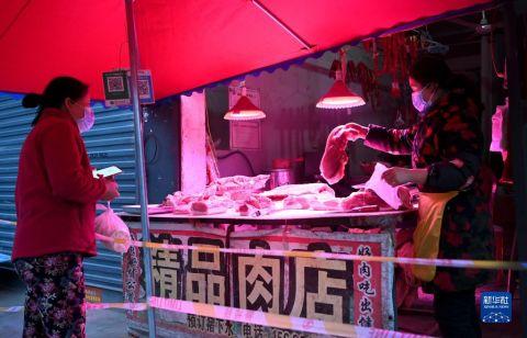 1月7日,西安市未央区西唐寨村村民在村里的肉店买肉。 新华社记者 刘潇摄