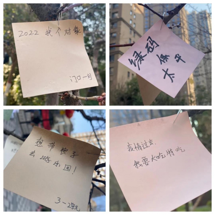 许愿树也引来了不少业主和小朋友们的“光顾”,大家用笔认真写下自己的愿望,为家乡和未来祈福。这些愿望中有的是期望疫情早点过去,有的是许愿疫情过后和朋们友尽情吃喝玩乐,还有的是许愿来年考一个好成绩,或者遇到一个心仪的对象,也有的是对医护工作者和志愿者们的感谢和满满的祝福……