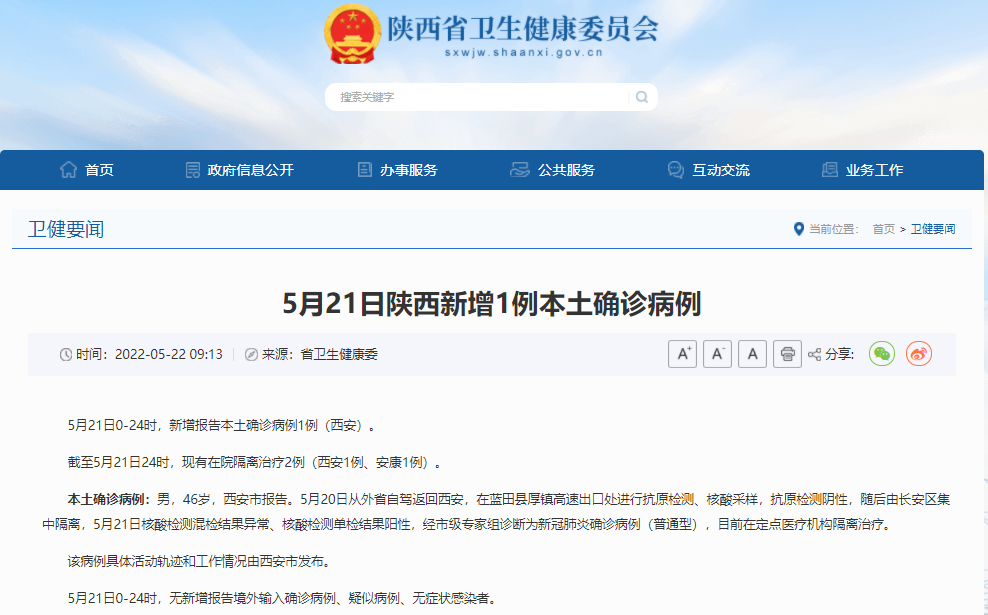 5月21日0-24时,陕西新增报告本土确诊病例1例(西安)。 截至5月21日24时,现有在院隔离治疗2例(西安1例、安康1例)。 本土确诊病例:男,46岁,西安市报告。5月20日从外省自驾返回西安,在蓝田县厚镇高速出口处进行抗原检测、核酸采样,抗原检测阴性,随后由长安区集中隔离,5月21日核酸检测混检结果异常、核酸检测单检结果阳性,经市级专家组诊断为新冠肺炎确诊病例(普通型),目前在定点医疗机构隔离治疗。 该病例具体活动轨迹和工作情况由西安市发布。 5月21日0-24时,无新增报告境外输入确诊病例、疑似病例、无症状感染者。